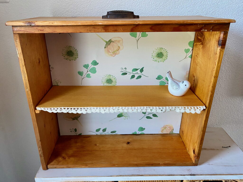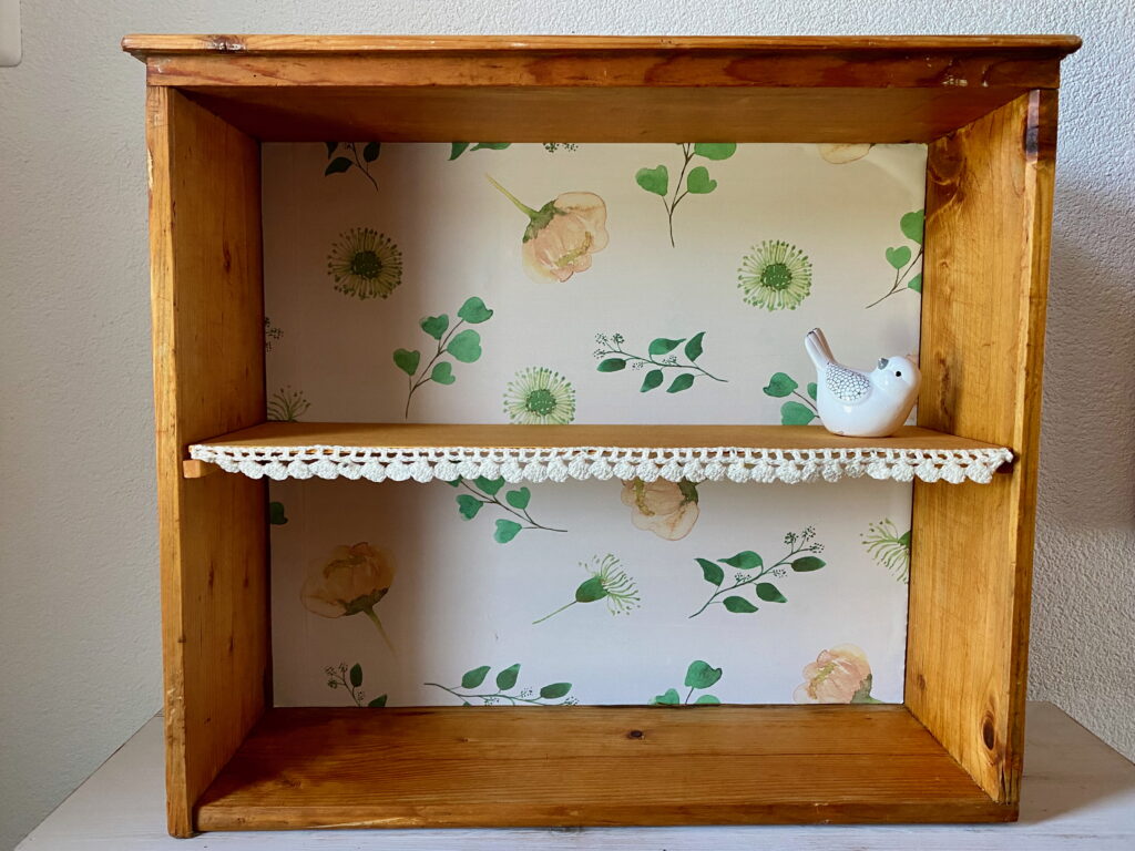 Schönes Regal/Gestell aus einer ausgedienten Schublade. Tannenholz mit schönem Griff aus Metall. Mit einem Tablar mit hübscher Spitzen-Bordüre. Rückwand: Tapete mit Blumenmuster. Zum Aufbewahren/Ausstellen von Büchern, Deko-Artikeln, Vasen etc. etc.