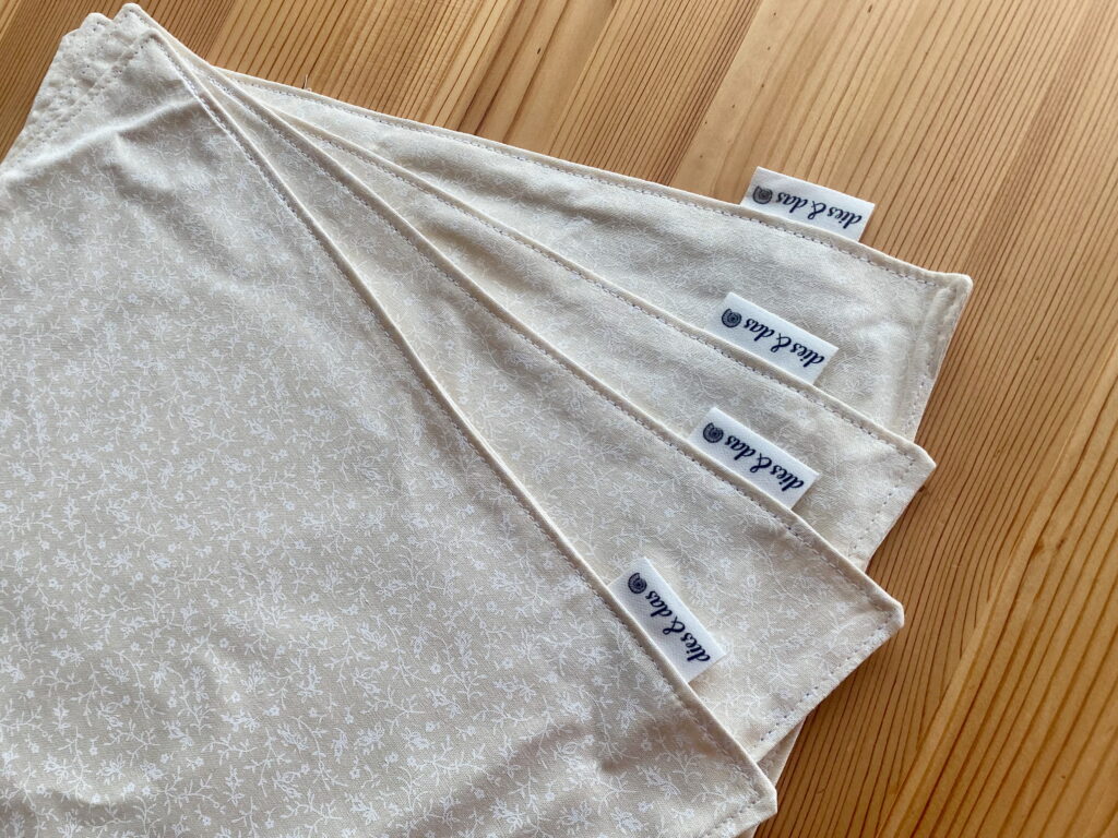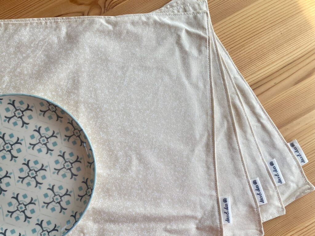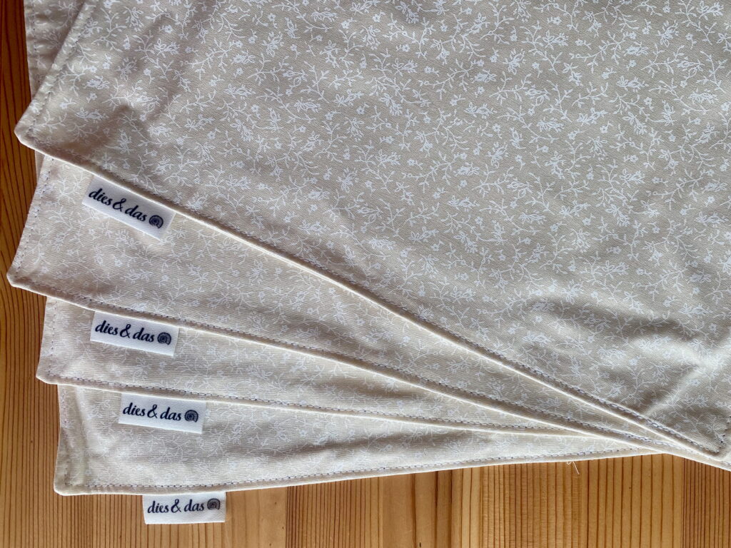 Sehr edle, schlichte Tischsets aus einem Baumwollstoff in hellem beige mit feinen, weissen Blätterranken. Passend zu fast allen Arten von Geschirr und sehr zeitlos. Können problemlos in der Maschine gewaschen werden.
