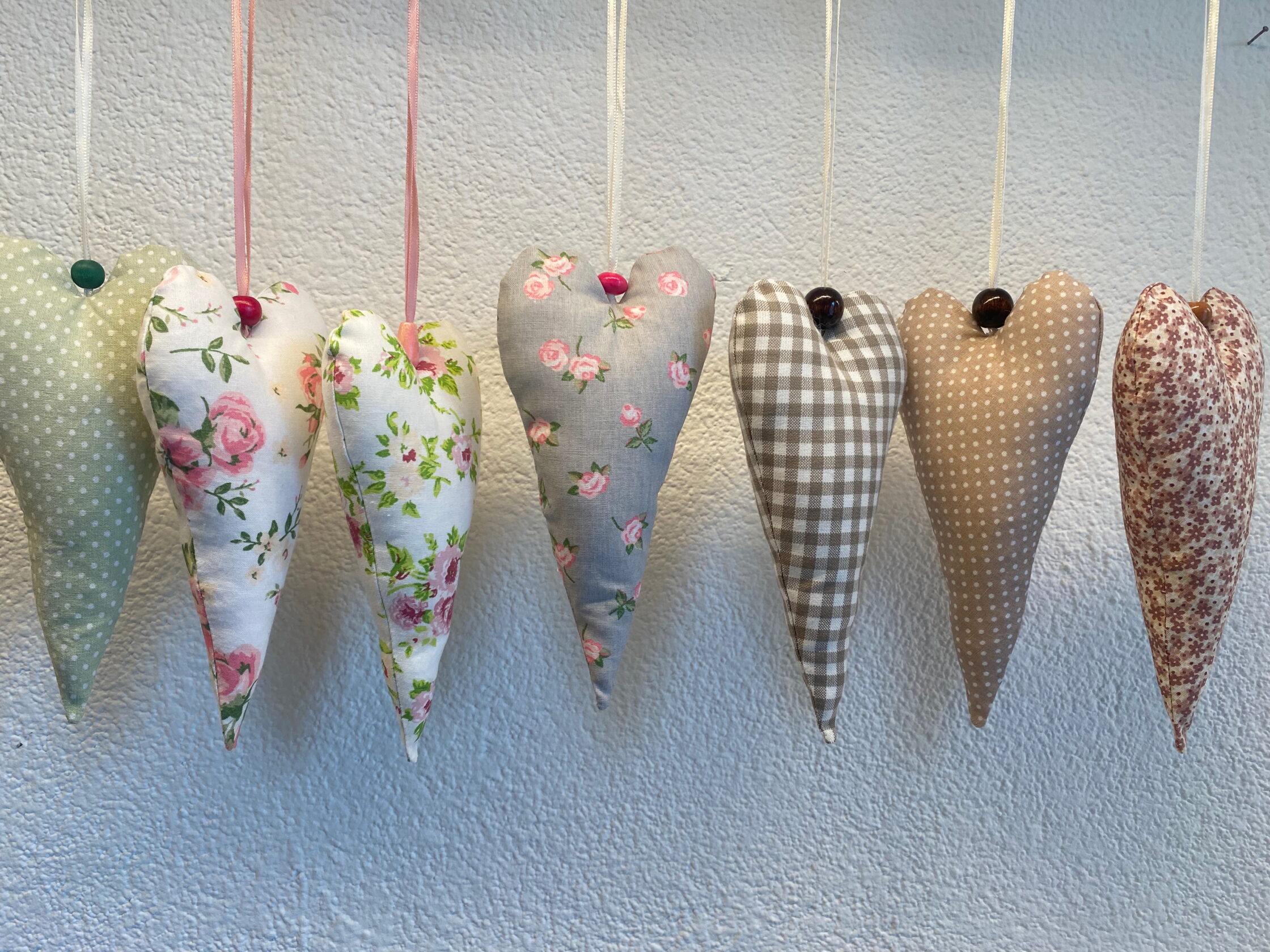 Herzige Stoffherzen zum Aufhängen in verschiedenen Farben und Muster (siehe Bilder). Hübsch als kleines Geschenk oder als Geschenkanhänger oder einfach so. Jedes Herz ist ein Unikat.